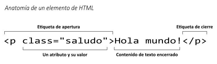 Un documento HTML es un documento de texto plano estructurado con elements (elementos en español) (art. en inglés). Los elementos están encerrados con parejas de tags (etiquetas en español) (art. en inglés) que realizan la apertura y el cierre . Cada etiqueta comienza y termina con paréntesis angulados (símbolos de menor que y mayor que (<>)). Existen unas pocas etiquetas vacías o nulas que no puede encerrar ningún texto, como por ejemplo <img> (art. en inglés).