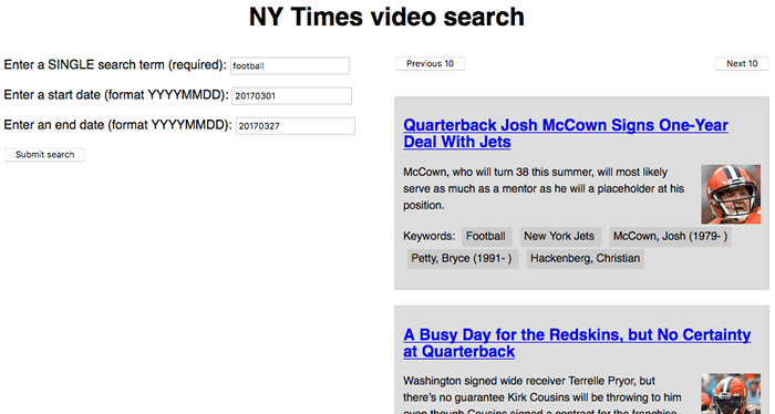 The app will end up allowing you to type in a search term and optional start and end dates, which it will then use to query the Article Search API and display the search results.