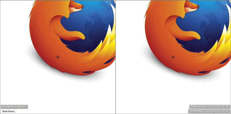 This is a simple 2.5D demo showing a Firefox logo seen on a left and right eye view, rendered on HTML5 Canvas. When you view the demo with a VR HMD and click the canvas, the demo will go fullscreen, and you'll be able to approach the Firefox logo. It will move realistically as you move your head towards and away from it, up and down and side to side, and rotate your head in any direction. 这是一个简单的 2.5D 的示例,在左右眼两个区域,以HTML5 Canvas的方式,同时渲染了 Firefox 的 LOGO。当你使用 VR 头显来观看这个示例时,点击画面,这个 DEMO 就会切换到全屏形式,可以尝试靠近 Firefox 图标。将会非常真实地同步你的头部运动后应该看到的内容,包括可以上下移动、左右移动、转动你的头部看想看的方向。